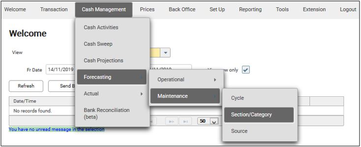 1. To view the existing forecast section/category, select Cash Management > Forecasting > Maintenance > Section/Category.