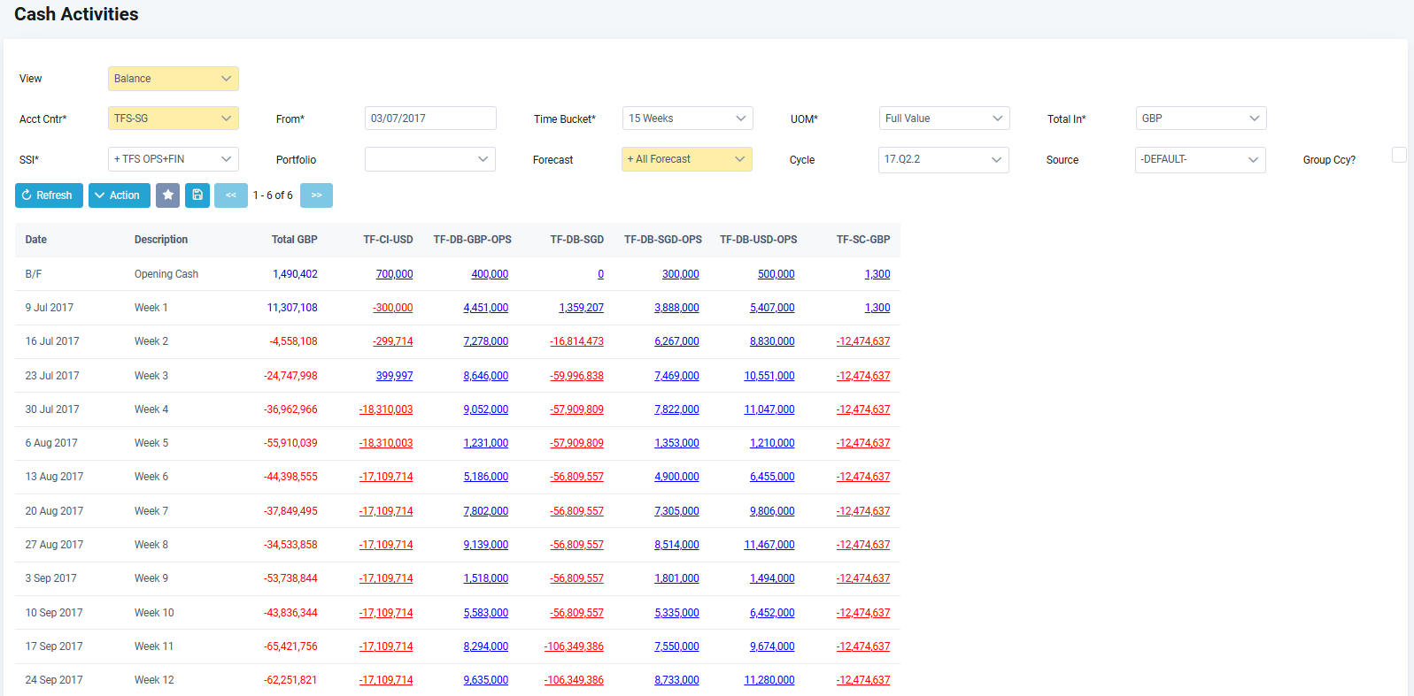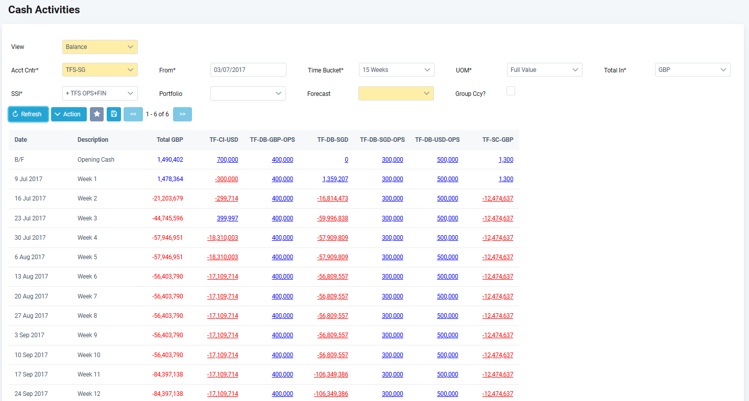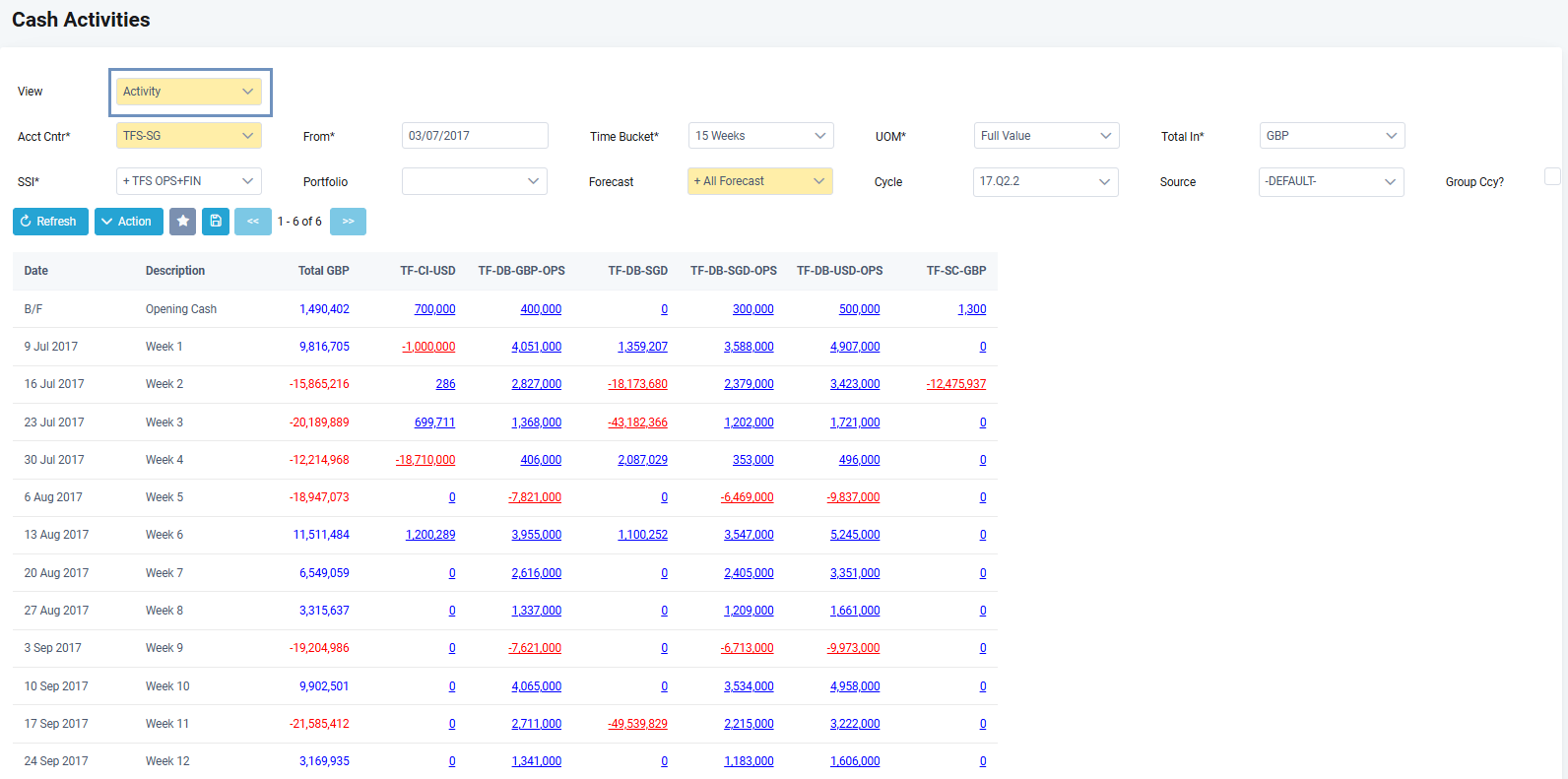 10. After all mandatory fields are filled in, click Refresh and the screen below displays. In this example, it shows a 15 weeks cash projection by SSI from 03-Jul-2017.