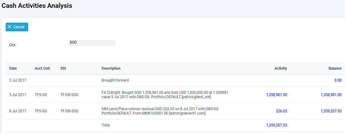11. If you click on the balance hyperlinks, a breakdown analysis for individual treasury activities will be displayed. The system shows the brought forward amount, the activities from the treasury transactions, and the total ending balance. In this example, the balance of 1,359,207, dated 09-Jul-2017 was chosen to show the screen below.