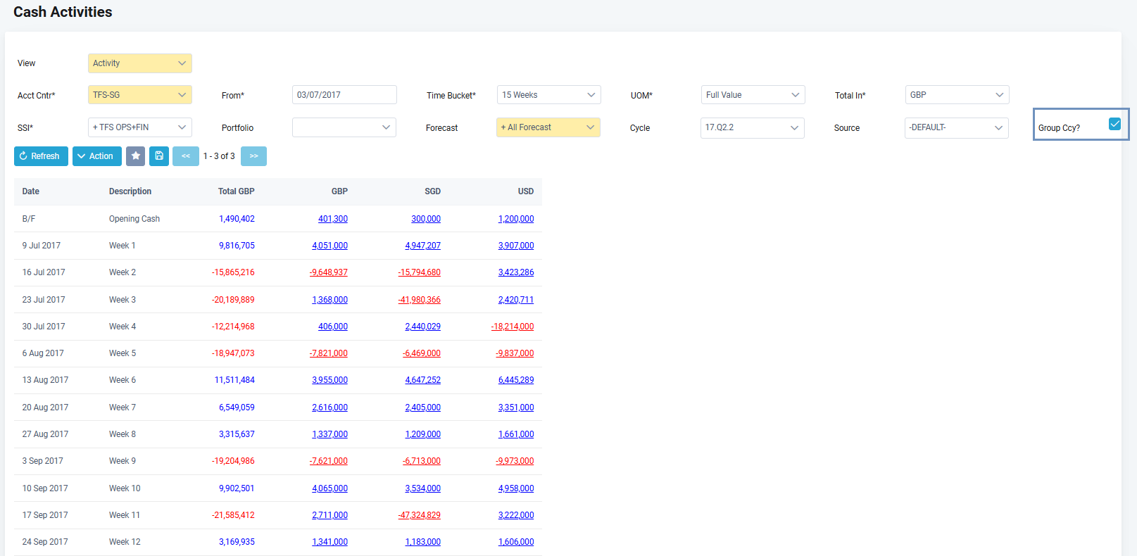 16. If you wish to view the cash activities projection by currency instead of SSI, tick on the Group Ccy checkbox, and click Refresh.