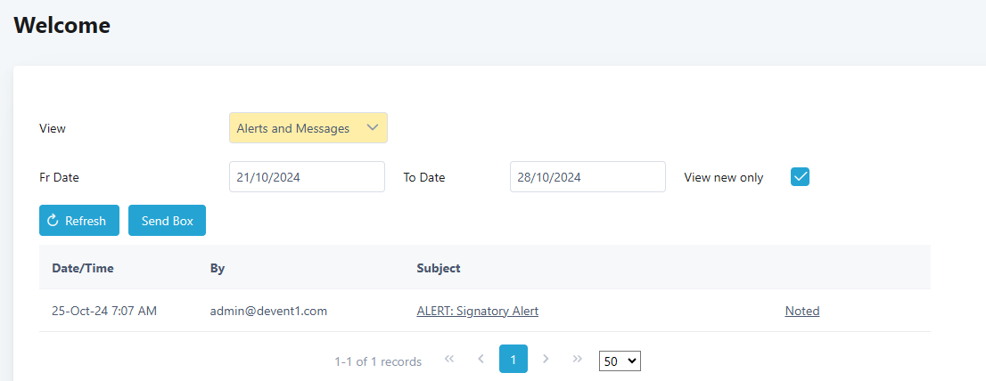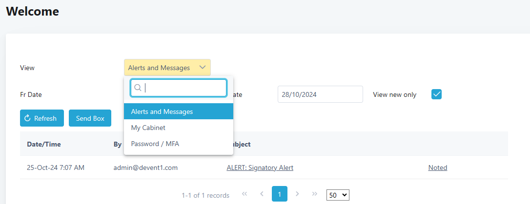 Welcome screen allows you to see any alerts and messages sent to you from the system, changing own password and set up multi-factor authentication. It also allows you to attach documents in My Cabinet.